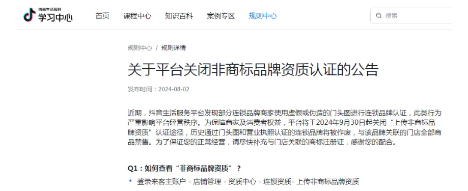 近日抖音发布公告,将关闭非商标品牌资质认证,以前上传的也会作废,只有补充商标注册证才可以,各大电商平台对商标有要求的,普推商标知产老杨以前分析过多个电商平台。